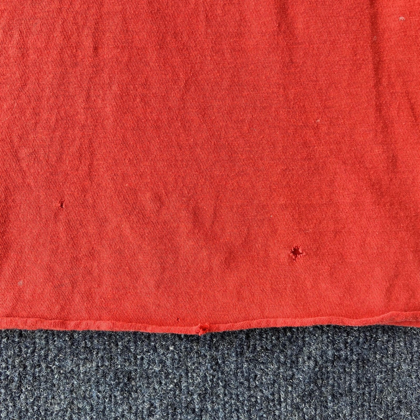 Visible distressing includes several small to medium holes, worn/faded graphic, light marks and paint transfer, and general fabric thinning