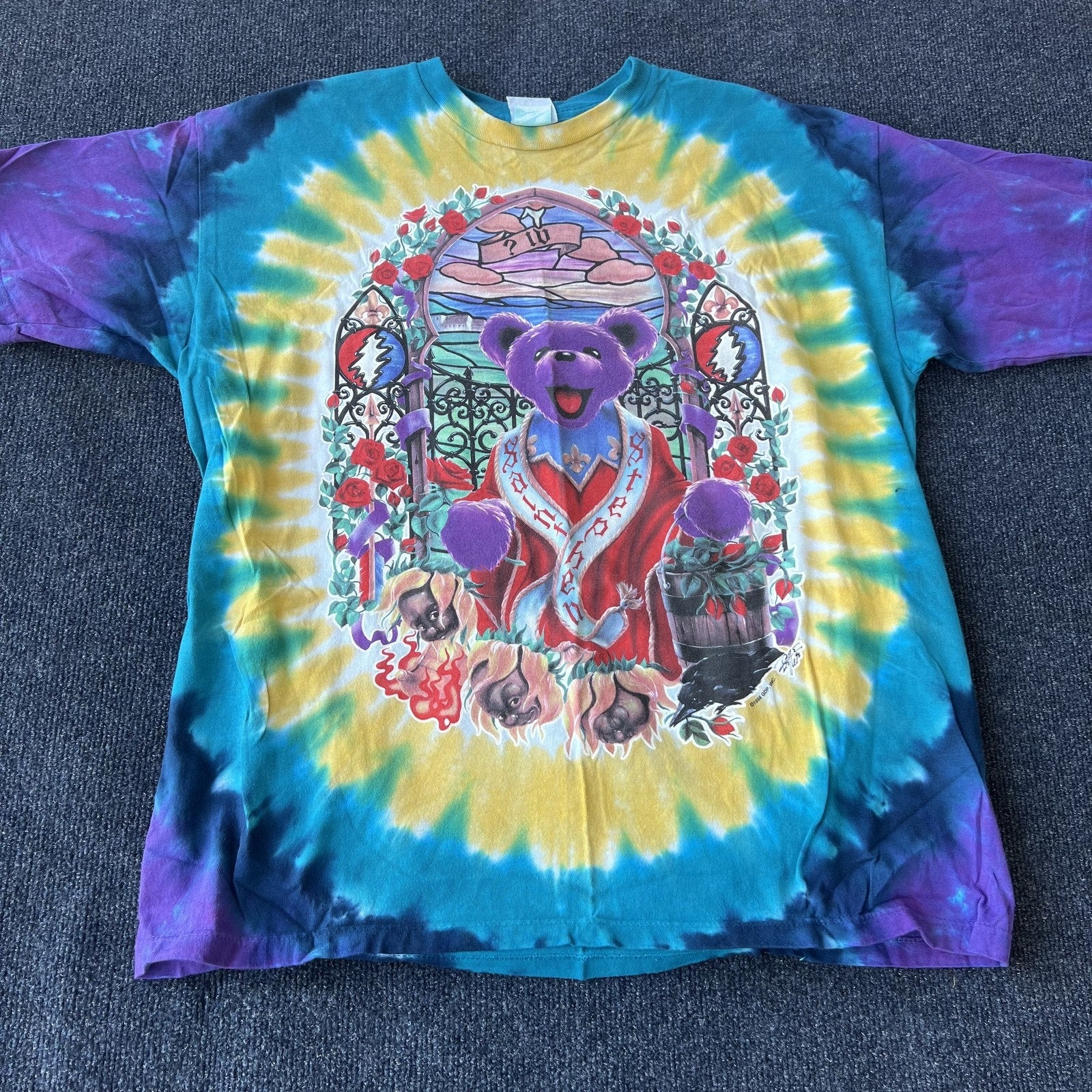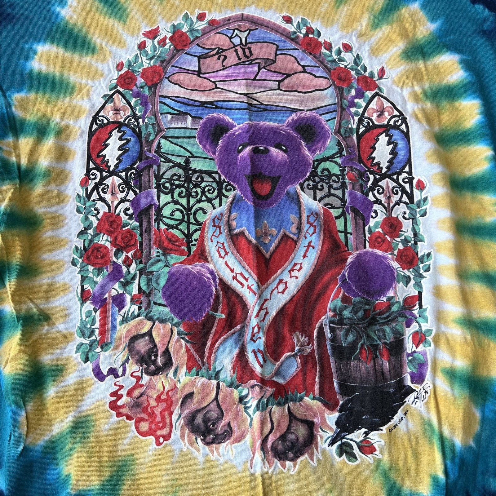 Features detailed stained glass-style front and back graphics with purple and green dancing bears, roses, lightning bolts, ravens, and Deadhead iconography.