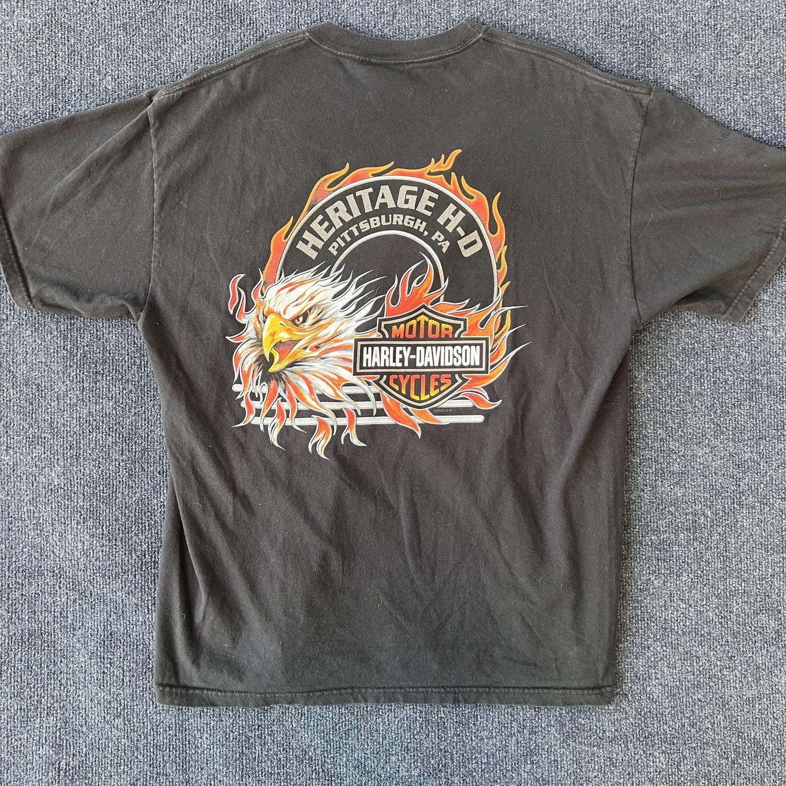 Back graphic: Heritage H-D Pittsburgh, PA flaming eagle with Bar & Shield logo
